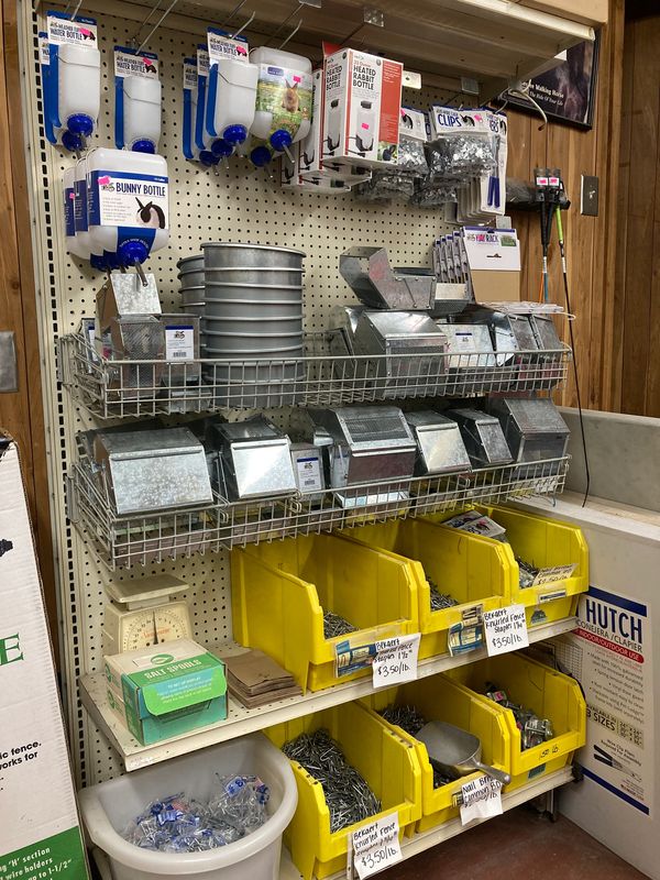 We carry a small selection of rabbit supplies ranging from water bottles, sift feeders, galvanized cups, salt wheels, nesting boxes, cage clips (j clips) and pliers, cages and drop pans.